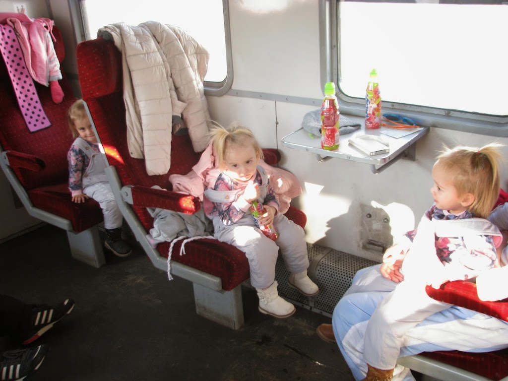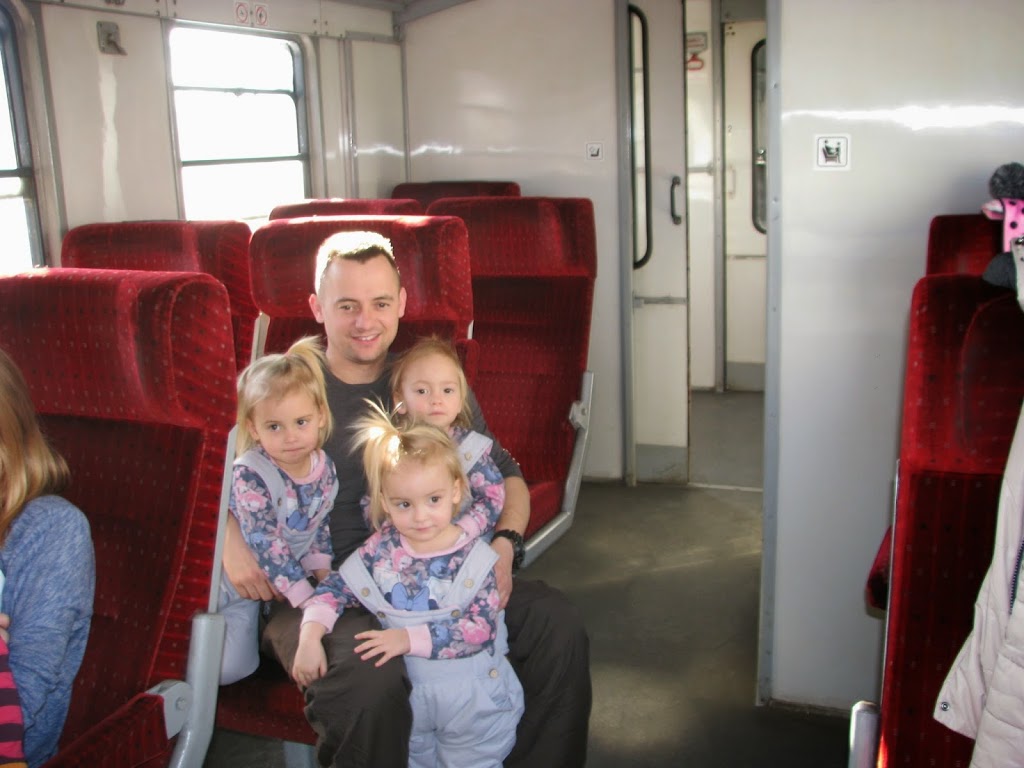 W drodze powrotnej do pociągu dziewczynki były tak zmęczone, że myśleliśmy że padną jak kawki kiedy  tylko pociąg ruszy. Hehe, ale głupki z nas, że tak pomyśleliśmy 🙂 W pociągu wstąpiły w nie nowe siły :))) odwiedziły nawet maszynistę, który nie mógł wyjść z podziwu, że to podwójne trojaki 🙂