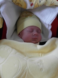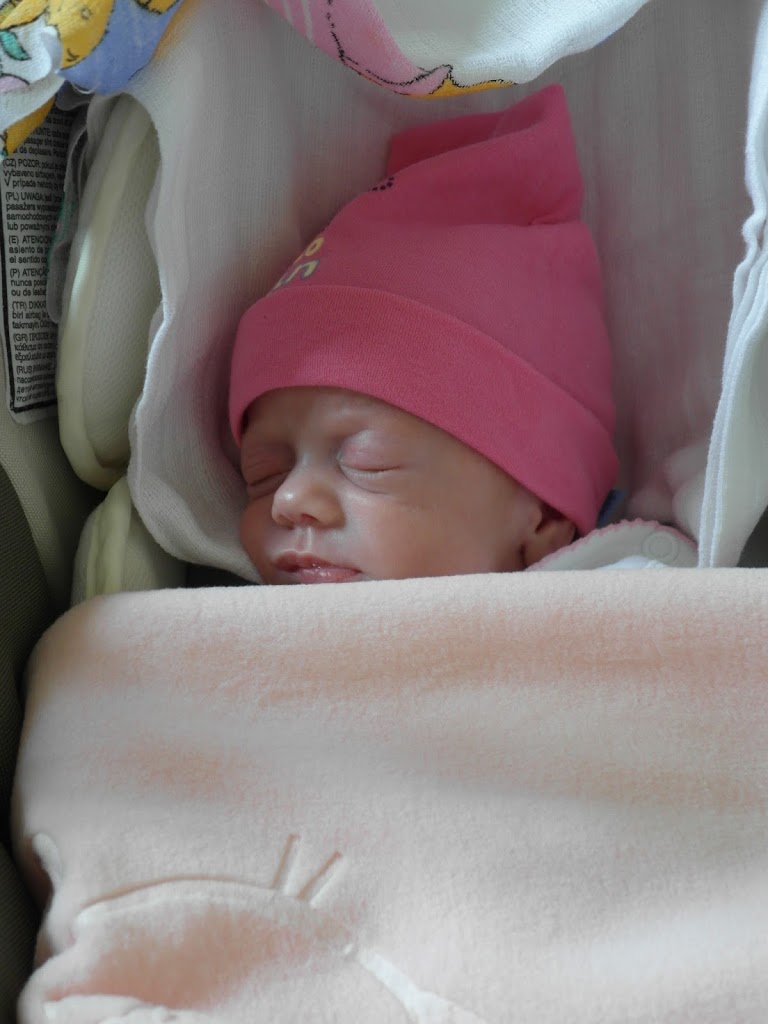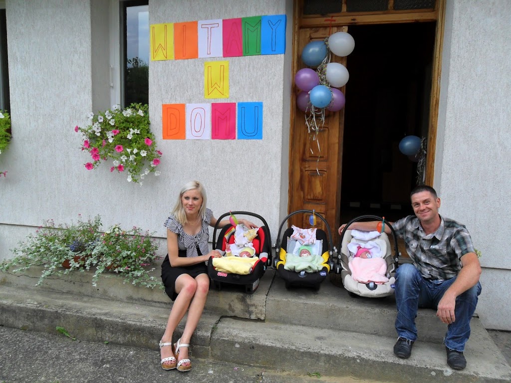 Nie mogliśmy doczekać się dnia kiedy dziewczynki wyjdą ze szpitala. Wreszcie nadszedł ten wyjątkowy dzień. Kilka dni wcześniej pani doktor powiedziała, że nasze córki są gotowe na wyjście do domu. Nadal bardzo bałam się o Lenkę, choć jej oddech był już ustabilizowany. Chciałam nawet kupić czujnik oddechu, ale pani pielęgniarka oddziałowa powiedziała, że to nie działa prawidłowo, bo testowały na oddziale i żebym uwierzyła w to, że naprawdę jest wszystko dobrze i nie wypuściłyby Lenki, gdyby miały jakieś wątpliwości. Przed wyjściem dziewczynek ze szpitala pojechałam do domu po ubranka i foteliki, rozglądałam się po pokoju czy wszystko gotowe. Pośrodku stało jedno wielkie puste łóżeczko, które za kilka godzin miało być wypełnione moimi księżniczkami. Nie mogłam się doczekać ich przyjazdu, a z drugiej strony czułam lekki strach i obawy czy sobie poradzę. Pojechaliśmy do Kr… weszliśmy na oddział a nasze córcie smacznie spały, daliśmy pielęgniarce ubranka do przebrania i poszliśmy porozmawiać z panią doktor, która zajmowała się dziewczynkami na oddziale patologii noworodka. Dostaliśmy kartę wypisu każdej z dziewczynek, 4 strony formatu A4 a na nich wszelkie zalecenia kontroli lekarskich i wskazania dalszego leczenia anemii ( dziewczynki podczas pobytu w szpitalu miały dwa razy przetaczaną krew z tego powodu ). Szczerze mówiąc, jak zobaczyłam te wszystkie zalecenia to troszkę mnie to przeraziło. Po otrzymaniu wszystkich dokumentów i podziękowaniu pani doktor poszliśmy po nasze dzieci, były już nakarmione, przebrane i czekały w kubełkach. Były tak maleńkie że ginęły w fotelikach, musiały mieć podkładane pod pupki pieluszki, żeby było im wygodnie. Był to niesamowity widok, nasze trzy córcie, leżące jedna obok drugiej, nie mogłam uwierzyć w swoje szczęście. Pożegnaliśmy się z paniami pielęgniarkami a wychodząc ze szpitala wszyscy się za nami oglądali 🙂 zrobiliśmy pamiątkowe zdjęcie i wyruszyliśmy do naszego domu. Dziewczynki całą drogę spały, a ja cały czas kukałam to na jedną, to na druga albo trzecią, moja reakcja na każdy ich ruch była natychmiastowa, po chwili stwierdziłam, że chyba przesadzam 🙂 Z drogi dzwoniłam do mojej mamy aby przygotowała mleko dla dziewczynek, żeby było od razu gotowe, jak tylko przyjedziemy. Dojechaliśmy szczęśliwie do domu a tu czekała na nas niespodzianka 🙂 Cała rodzina w gotowości, wielki transparent powitalny i pachnący dom od kwiatów. Byli wszyscy ci, na których mogliśmy liczyć.
