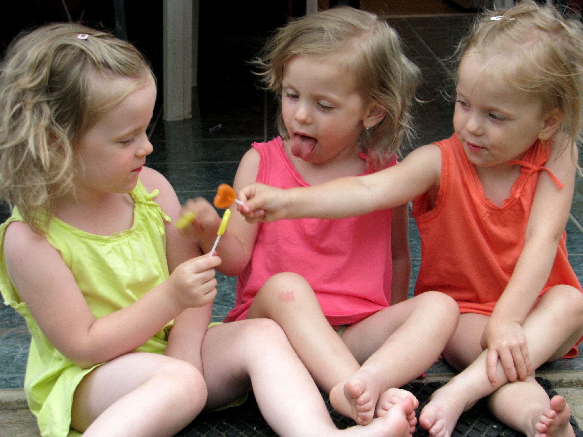 Podobnie jest w codziennym życiu. Kiedy idę z jedną do lekarza i ta dostaje naklejkę z napisem „Dzielny pacjent” to upomina się o jeszcze dwie, dla pozostałych sióstr. Nasza pani doktor już się nauczyła  i od razu wyciąga z szuflady trzy i mówi: „Dla Ciebie i siostrzyczek  :)”  Tak samo jak z naklejkami jest z dzieleniem się np. słodyczami. Jedna przychodzi wyciąga coś z magicznego  koszyczka na lodówce i od razu mówi: „Biorę dla dziewczyn”, potem biegnie ze swoją zdobyczą, oznajmiając wszem i wobec że coś dla nich ma.