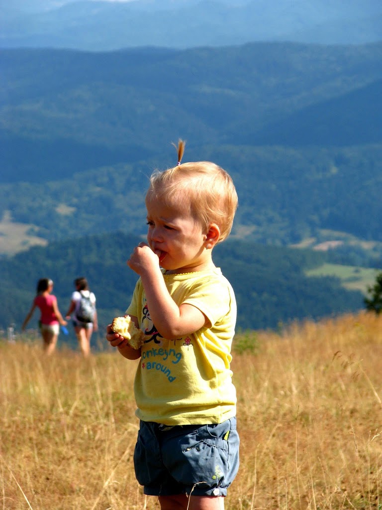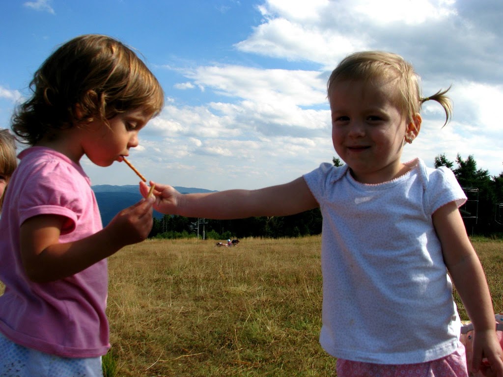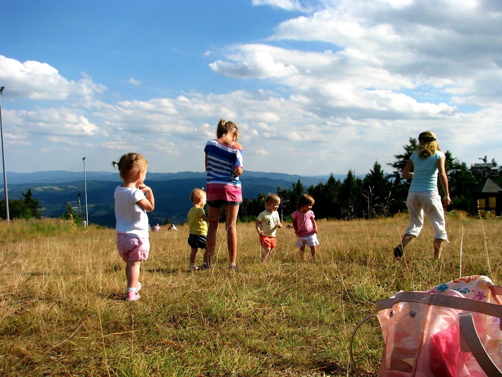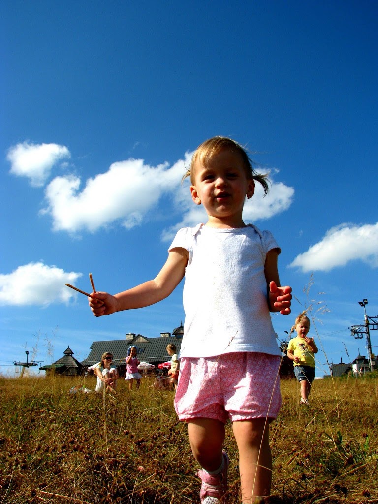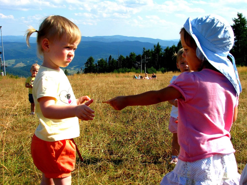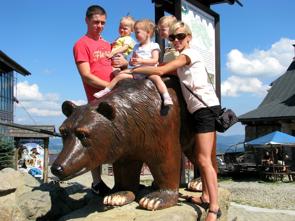 Piękna słoneczna niedziela, od rana zastanawialiśmy się gdzie tym razem pojechać z dziećmi. Zdzwaniałam się z Madzią, która wypoczywała ze swoją rodziną w Wysowej i tak od słowa do słowa wyszło, że oni też gdzieś chcą się wyrwać. Umówiliśmy się o 15:00 na parkingu pod Jaworzyną Krynicką 🙂 Zebrałam całą moją ferajnę, zapakowałam prowiant i wyruszyliśmy w kierunku najbardziej przez nas lubianym czyli na Krynicę 🙂 Nie mogłam doczekać się spotkania z mamą Madzią i jej przecudną Karolinką (już kiedyś pisałam o blogu, który Madzia niestety zakończyła, ale warto do niego zaglądnąć, bo to dla mnie najpiękniejszy blog, który czytałam i często do niego powracam, adres do bloga Tutaj ) Oczywiście na przywitanie uściski i całusy, kupiliśmy bilety na kolejkę i zapakowaliśmy się wszyscy do jednego wagonika 🙂 Po drodze Karolka rozpieszczała nasze uszy pięknymi zdaniami, których osobiście nie mogę się doczekać u moich córek, podziwialiśmy przepiękne widoki i próbowaliśmy zająć czas osobie, która bała się wysokości (wtajemniczeni wiedza o kogo chodzi :)) Na szczycie Jaworzyny wyłożyliśmy się na trawie i rozkoszowaliśmy się naturą 🙂 Początkowo Karolka i moje maluchy podchodziły do siebie z dystansem, ale po chwili znalazły wspólny język 🙂 Oczywiście mama Madzia sypała zabawami jak z rękawa, jak nie zabawa w „łapki” to w gonitwę, zadbała również o zapełnienie naszych brzuszków, bo zajadaliśmy się przepysznym ciachem od mamy Madzi 🙂 Nie zabrakło też „podlewania” przez nasze dzieciaki szczytu góry 🙂 (o nauce sikania już niebawem)