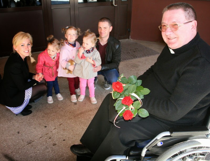 Moje dziewczynki bardzo lubią ks. Stasia z wzajemnością z jego strony, dlatego nie mogło zabraknąć nas w tym dniu by złożyć mu życzenia. Moje dziewczynki dzierżyły w swoich rączkach różyczki i oczekiwały na przybycie jubilata. Przywitał nas uśmiechem, którego mimo strasznego cierpienia nigdy nie brakuje na jego twarzy. Wiem ze swoich źródeł, że sprawiliśmy mu ogromną radość swoim przybyciem.