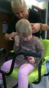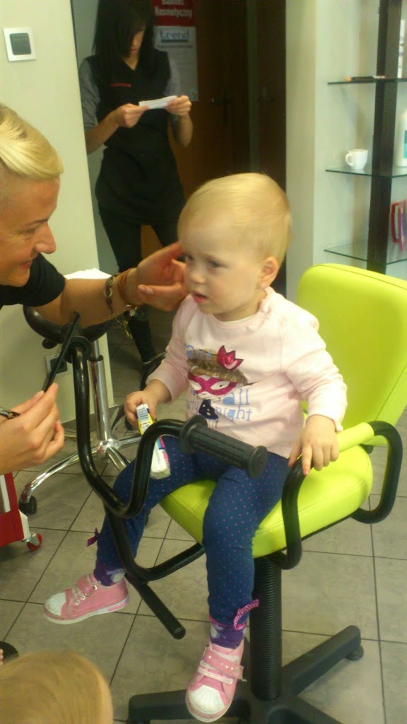 Kolejna była Lenka. Ona to praktycznie w ogóle nie ma włosków, tzn ma ale tylko grzywkę 🙂 z tyłu włosów brak. Kiedy usiadła na fotelu troszkę się bała i na początku strasznie się wierciła i nie pozwalała się obciąć, ale po chwili kiedy zaczęłam jej tłumaczyć, że pani podetnie tylko grzyweczkę, pozwoliła na pierwsze cięcie i była przy tym bardzo skupiona 🙂