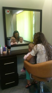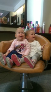Zaklepałam datę, godzinę no i, poszłyśmy na pierwszą wizytę do fryzjera. Wiem, dziewczynki nie mają jakiś bujnych fryzur,ale chciałam aby nasza fryzjera wyrównała te strzępki 🙂 Zabrałyśmy do pomocy ze sobą Gabi (mamę chrzestną Tosi), bo nie wiedziałam jak dziewczynki zareagują na nożyczki.