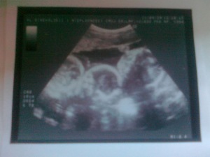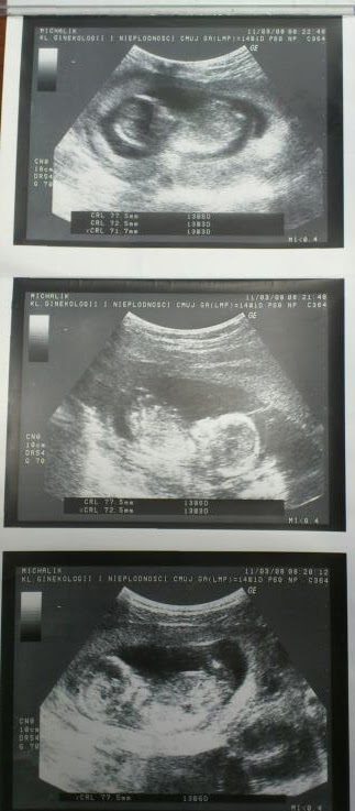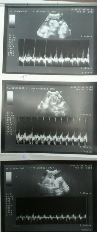 Nadszedł tydzień w którym przyszedł czas na zrobienie USG genetycznego, strasznie się go bałam, przed jego zrobieniem nie spałam cała noc. Bałam się o nasze dzieci, bałam się czy podczas badania nie okaże się, że któreś jest bardzo chore, tak jak każda przyszła mama chciałam żeby było wszystko dobrze, miało rączki, nóżki, paluszki, zdrowe serduszko, po prostu zdrowe i rozwijające się prawidłowo. A przecież była ich trójka, w takim małym brzuszku, zawsze mogło być coś nie tak. Czekałam razem z mężem pod pokojem badań, niestety profesor nie mógł wykonać badania, i przeprowadził go lekarz opiekujący się mną na sala. Mąż czekał za drzwiami. Pan dr mierzył każde dziecko poklei, zaczynając od nóżek, kierując się w stronę główki, trwało to bardzo długo, a że dzidzia mieszcząca się na górze uciskała mi tętnicę to podczas USG traciłam przytomność i musieliśmy robić przerwy między dzidziusiami. Podczas badania słuchaliśmy serduszek i był to najcudowniejszy dźwięk jaki mogłam usłyszeć w swoim życiu, mogła bym go słuchać bez końca. Zadawałam mnóstwo pytań, o to czy mają jakieś wady? czy rozwijają się prawidłowo?, ile ważą, jakie duże? itp. Pan doktor uśmiechał się do monitora, i mówił „ale one figlują”  zapewniał też, że na dzień dzisiejszy wszystkie prawidłowo się rozwijają i mamy się nadal tak dzielnie trzymać, jak do tej pory. Po wszystkim mój wynik USG wyglądał jak niezły tasiemiec 🙂 mierzył chyba 50 cm 🙂 Ja byłam już spokojna, chodź przyznam, że przechodziły po mojej głowie myśli, czy oby dobrze sprawdził każde dziecko? mógł się pomylić i na przykład zbadać jedno dziecko dwa razy. Wyszłam na korytarz a mój mąż miał przerażoną minę, dopiero kiedy się uśmiechałam i pokazałam tasiemca, opadły mu nerwy. Każda kobieta czekająca przed gabinetem zerkała z niedowierzaniem jaką ilość zdjęć pokazuje mężowi. Pewnie pomyślały, że robiłam sesję zdjęciową naszemu maluszkowi 🙂 Przy każdym następnym USG oglądałam te nasze boskie maluszki, słuchałam serduszek, i cieszyłam się jak ich waga rośnie z tygodnia na tydzień. Pamiętam USG gdzie nasze dzieciaki ułożyły się wszystkie główkami w jedną stronę, Pani dr która przeprowadzała badanie mówiła: ” Matko jaki cudowny widok, wszystkie główki koło siebie, chyba jeszcze nigdy nie widziałam czegoś takiego – robię im zdjęcie. ” Zawsze lubiłam patrzeć na lekarzy którzy robili mi USG, nawet ci mało mili lekarze uśmiechali się do monitora 🙂  Kiedyś profesor wziął mnie na badanie chciał zażartować i mówi ” O chyba jeszcze jedno się gdzieś tu schowało, brakowało im jednego do brydża – żartowniś 🙂 A ja cały czas odpoczywałam, słuchałam wszystkich zaleceń lekarzy, musiałam dbać o Nasze dzieci, które były dzielne i silne jak ich mama i tata…